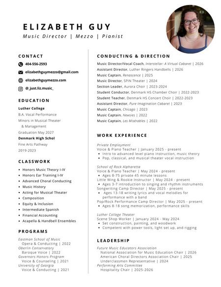 Elizabeth graduated from Denmark High School on the fine arts pathway in 2023. She attended GMEA All State Chorus five years, GMEA All State Reading-Chorus two years, and NAFME All National Choir one year. She also attended Forsyth county district honor choirs five times. She competed in GHSA Literary three years, and won first at the state level for girls trio in 2022 and 2023. She also won first at the state level with a perfect score of 100 for girls solo in 2023. As part of the Denmark HS theater department, Elizabeth served as a music captain for three mainstage shows, Les Miserables, Newsies, and Chicago. Newsies won the Shuler award in 2023 for best music direction. In her senior year, Elizabeth assistant directed and stage managed a cabaret production of Pure Imagination. In classes, Elizabeth earned a 5 on her AP Music Theory exam, and served as a student conductor/director for a first year choir and theater class. She conducted several pieces in concert for the chamber choir and concert choir.