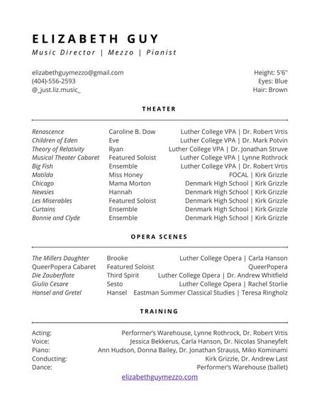 In January 2026, Elizabeth launched an independent project studying music direction and vocal pedagogy. With eighteen singers, Elizabeth led over 30 hours of music rehearsals and coachings culminating in a virtual cabaret production. More information regarding this project and music direction reels can be found on the reels tab above.